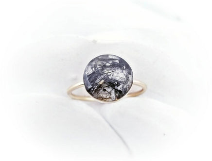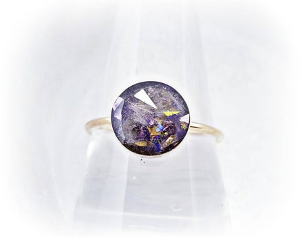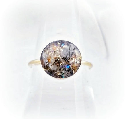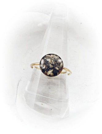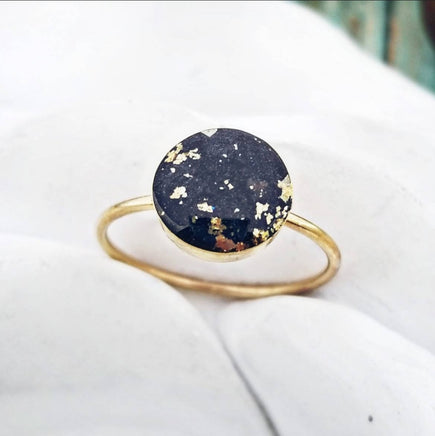 The stone in this ring is made using your pet or loved one's ashes, along with a resin blend of pigments and glitter. The band is 14k gold or rose gold filled.
