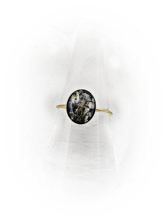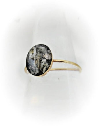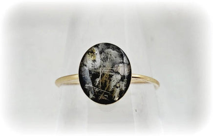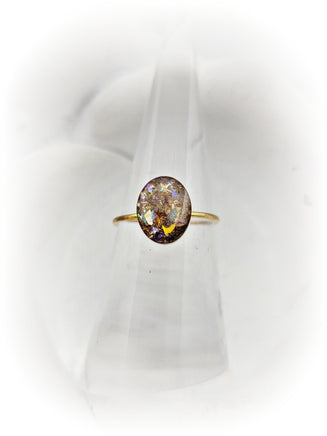 The stone in this ring is made using your pet or loved one's ashes, along with a resin blend of pigments and glitter. The band is 14k gold filled.