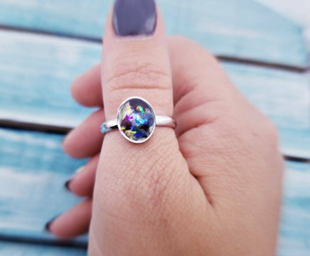 These 8x10mm oval rings can be made using funeral or wedding flowers (pictured) or using your loved ones ashes, flowers, or hair. The flowers are visible in the stone.
