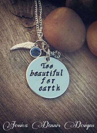 This necklace is a special keepsake for one who has experienced the loss of a child or infant. I have hand stamped, one letter, one hammer strike at a time, "Too Beautiful for Earth" onto a lightweight aluminum disc and added an angel wing charm and a swarovski birthstone crystal. The round 1" pendant is made of lightweight hypoallergenic grade aluminum that will not tarnish. The charms adorn a dainty sterling silver plated chain with a lobster clasp.