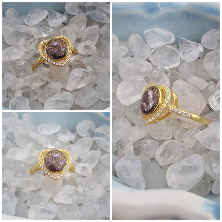 The center stone in this ring is made using your pet or loved one's ashes, along with a resin blend of pigments and glitter. The band is 14k gold plated. The base metal is sterling silver.