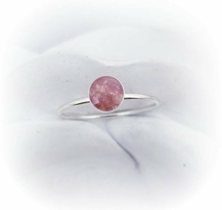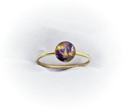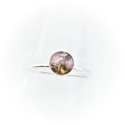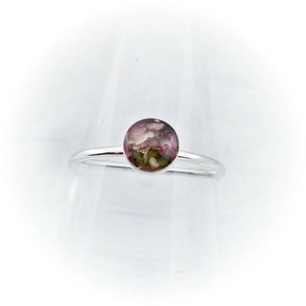 These 6mm rings can be made using funeral or wedding flowers (pictured) or using your loved ones ashes, flowers, or hair. The flowers are visible in the stone.