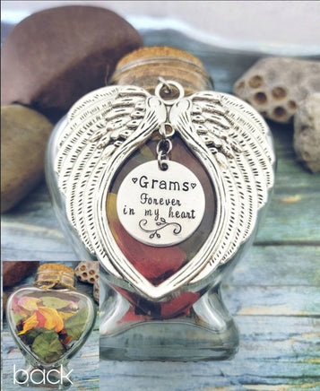 You will receive 1 small 4" x 2" glass heart jar with an angel wing pendant and personalized disc pendant hanging from the front. You will need to add the flowers to the jar when you receive it.