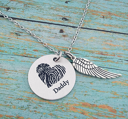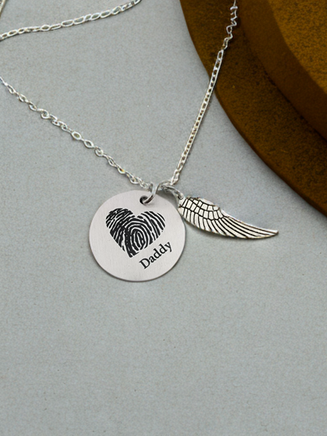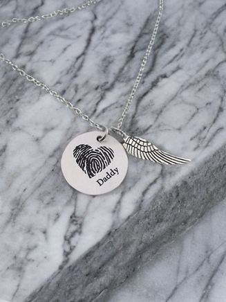 These fingerprint necklaces are made using a photo of your loved one's fingerprint. The photo will be enhanced and darkened to the best of our ability using digital design. Please note that all fingerprints are different and may not always turn out super crisp, however I do my very best to make them look perfect. The fingerprint will be cropped into a circle to fit the design as pictured.