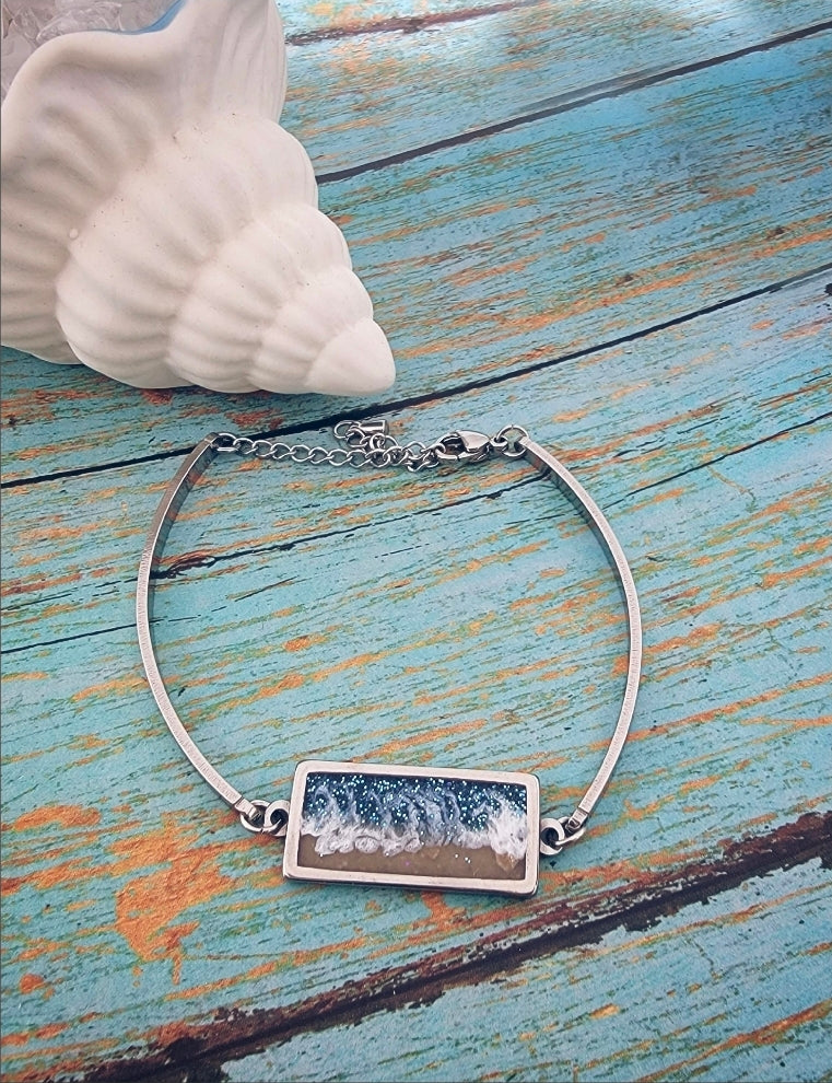 This 10x25mm bar bracelet is made using your loved one or pet's ashes as the sand. The chain is asjustable. All parts are hypoallergenic and will never tarnish. The bracelet is adjustable.
