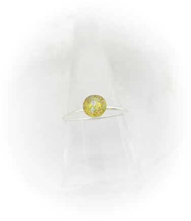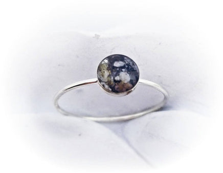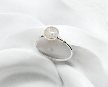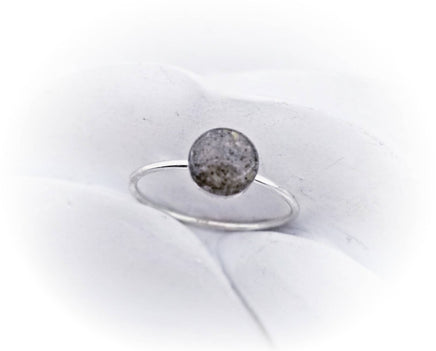 This sterling silver ring is made using your loved one's ashes and a special resin blend creating the birthstone of your choice. Photo 1 shows a yellow iridescent stone (available but not on the color chart).