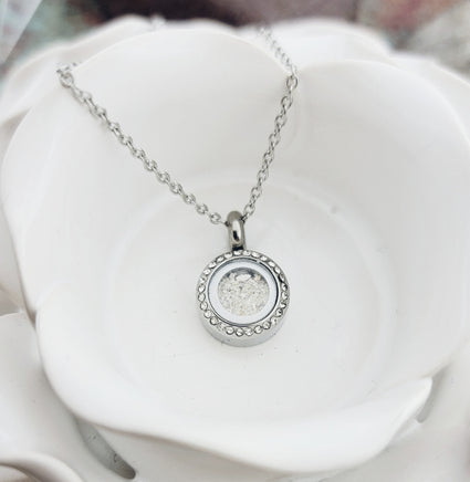 This stainless steel glass cremation locket can hold your loved one's ashes, hair, crushed flowers from a loved one, or even sand from your favorite beach. The urn pendant measures 13mm.