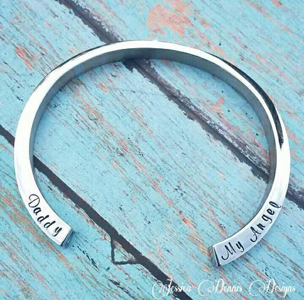 These stainless steel cuff bracelets are hand stamped with up to 15 characters on each side of the bracelet. Please include spaces when counting characters. The cuff bracelet doubles as a wearable urn so you can carry your beloved pet with you always. There is a little screw that can be opened, and a funnel (included with your purchase) is used to transfer ashes conveniently. I recommend adding a drop of super glue to the screw before closing to ensure it stays in place. The cuff will fit 7-8" wrists. They are high quality and super durable, making them non-adjustable. I cannot stamp the front, only the top as pictured.