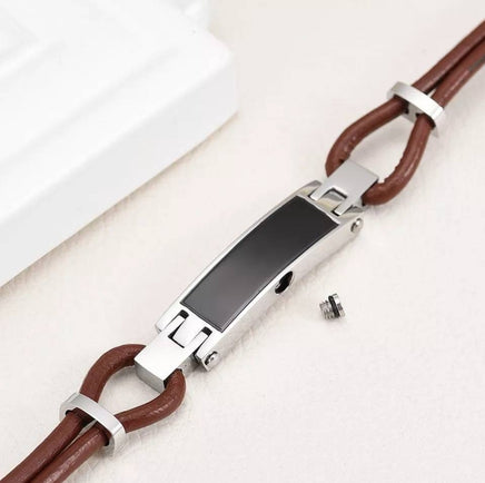 This beautiful stainless steel and leather bracelet is made to hold some of your loved one's ashes. The rectangle stainless steel pendant has a screw in the bottom to add ashes. Each order includes one funnel/filling kit. The bracelet is 24cm long (9.4").
