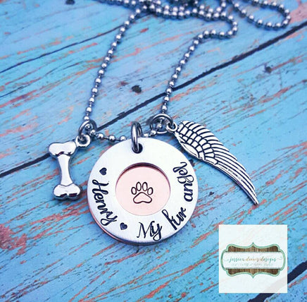 Hold your pet close with this beautiful pet memorial necklace. Each Includes a 1" hand stamped copper disc, layered under a 1" washer pendant (which reads "My Fur Angel", along with the pet's name), a bone charm, and an angel wing charm. The pendants grace a stainless steel ball chain.