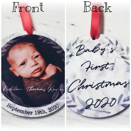 This beautiful 3" ornament can be personalized with your baby's name and the year of your choice. I have designed this piece with a marbled background and a pretty floral border.
