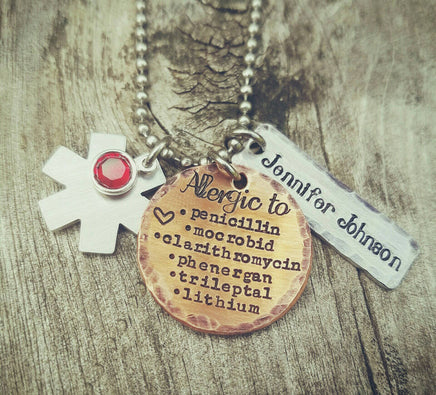 Please choose your pendant quantity from the drop down menu and leave a note to seller during the checkout process including the customization you'd like for each pendant including the shape and metal you'd like if you have a preference. The metal choices are Nugold, silver, and copper. I can fit quite a lot of information on these necklaces, but if you are unsure of how many pendants you will need, please send me a message. Each includes a medical alert pendant which is also stampable, and a red swarovski crystal charm. Additional pendants should be chosen from the drop down menu.